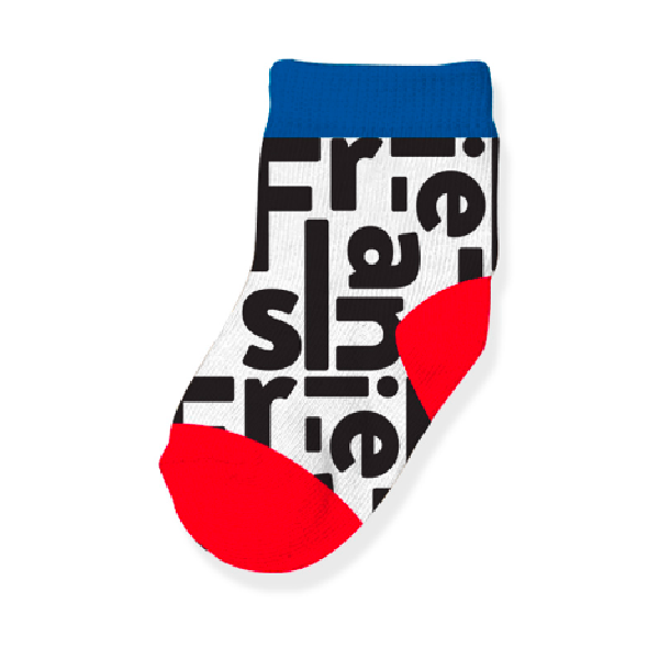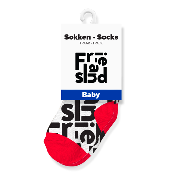De sokjes hebben het zwart-witte Friesland ontwerp. Ze zijn extra leuk door de rode accenten op de hak en bij de tenen in de typische rode kleur, net als de symbolische Friese pompeblêden. Bovenaan het sokje zit een elastische band in een frisse blauwe kleur. Hierdoor zakken ze minder snel af.