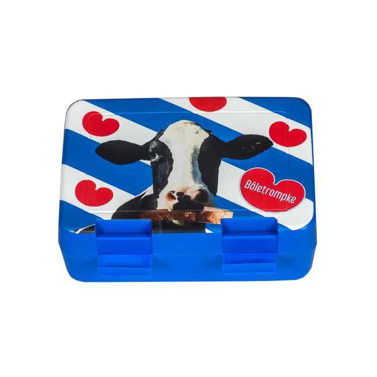 De blauwe trommel heeft aan de bovenkant de opdruk van de Friese vlag met de afbeelding van een ludieke koe (met een boterham in de bek) en natuurlijk een opvallend rood pompeblêd.