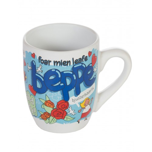 De mok heeft een vrolijk cartoondesign en heeft de tekst “foar mien leafe beppe”, wat in het Nederlands betekent “voor mijn lieve oma”. De mok heeft fraaie Friese teksten en illustraties.