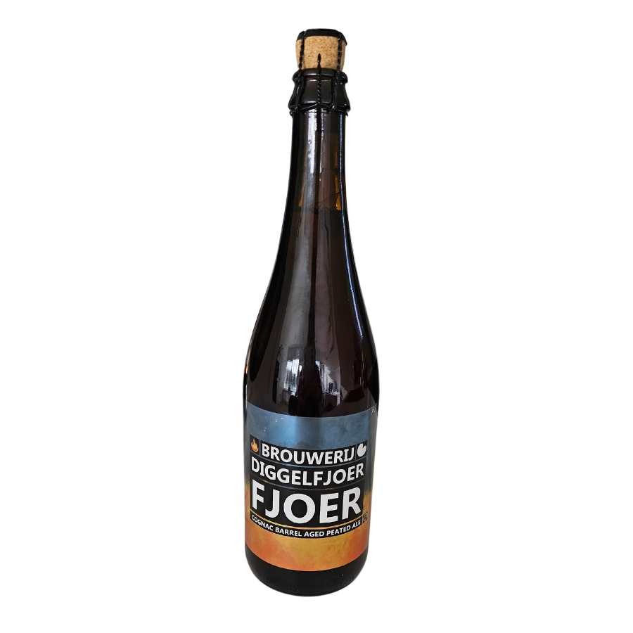 Een heerlijke Diggelfjoer Fjoer cognac barrel age peated ale is een heerlijk bier in een fles van 75 cl. met een champagnekurk.