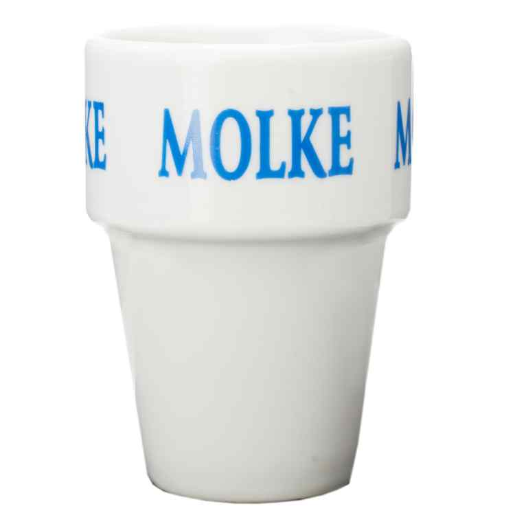 Melkbeker Molke vorm verlopend daardoor betere handgreep. Molke ook wel Melk. Tekst rondom. Ook verkrijgbaar met test Suppe en abeelding koeien.