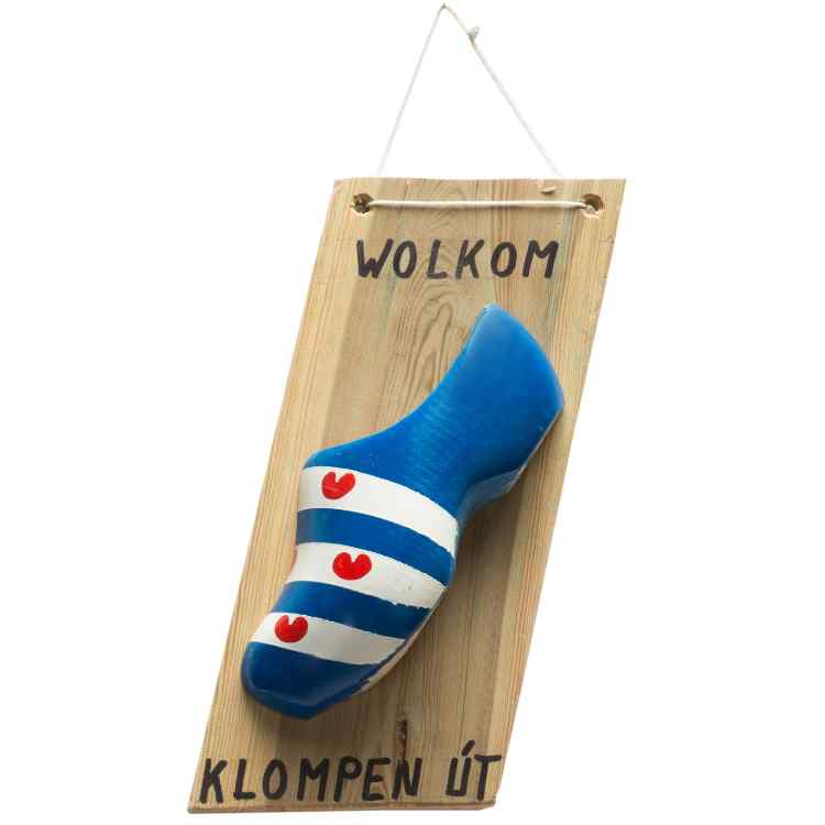 Dit houten bord heeft in zwarte letters de tekst “Wolkom, klompen út” en bevat een halve klomp in een blauwe kleur met daarop de Friese vlag.