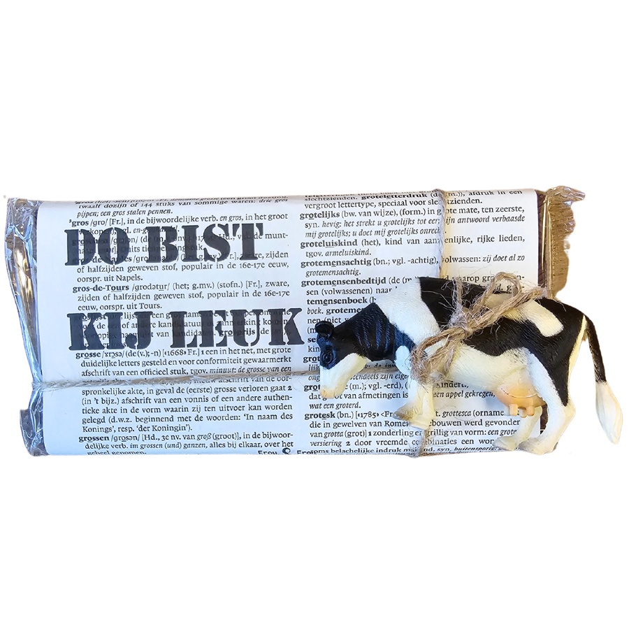 Een (h)eerlijke Friese chocoladereep Do bist kij leuk. Gemaakt in het Friese Achlum, met een unieke wikkel met Friese tekst gemaakt door Frou & Frou Sûkelade en Mear.