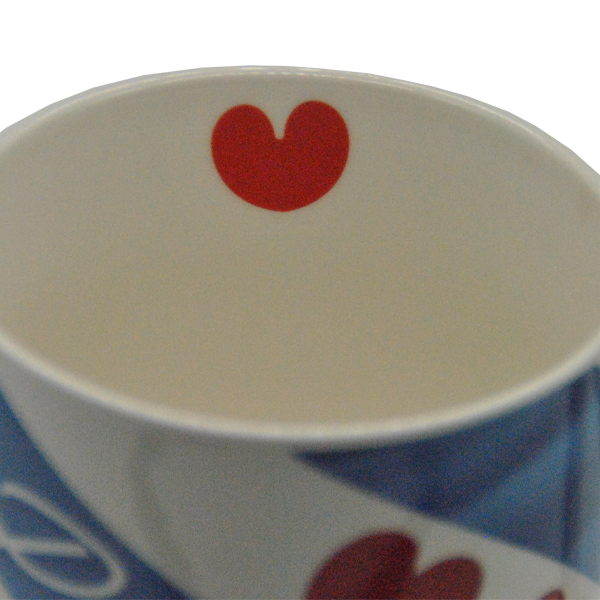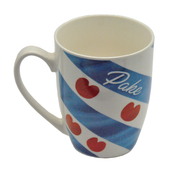 Deze porseleinen mok is wit van kleur met de opdruk van de Friese vlag. De mok heeft daardoor mooie heldere kleuren.  Met aan de binnenkant een pompeblêd zoals de Friese vlag.