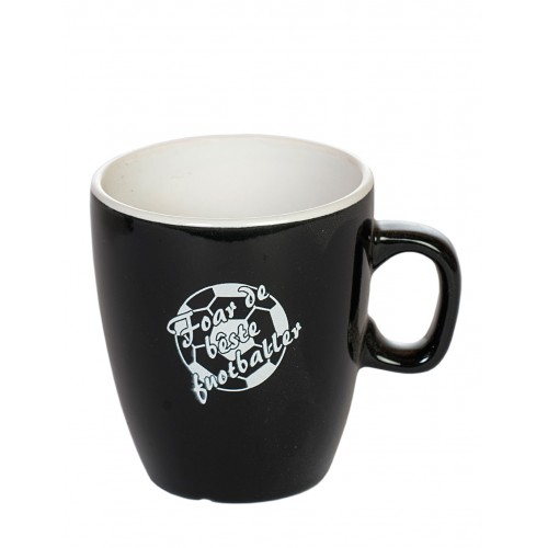 Mok Senseo zwart met tekst foar de bêste fuotballer en illustratie voetbal. Kleur mok zwart. Afmeting hoog 8,5 cm en doorsnee 7,5 cm