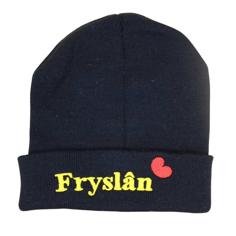 De muts heeft een zwarte kleur. De gele tekst en het pompeblêd voegen een vleugje Friesland aan de muts toe.
