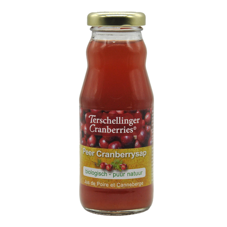 Biologische Terschellinger Cranberries  Peer Cranberrysap – puur natuur. Heerlijk sapje voor bij het ontbijt of gewoon tussendoor. Ooit spoelde er een krat aan op het strand van Terschelling. In de aangespoelde kratten zatten Cranberries die wild gegroeid zijn op het prachtige Friese Terschelling. Cranberries zijn goed voor geest en lichaam.
