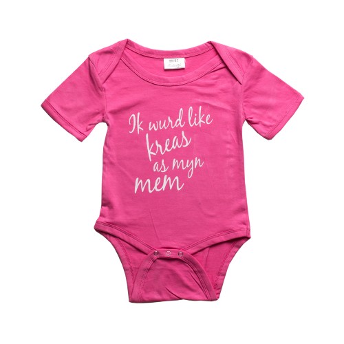 Op deze romper staat in witte letters de Friese tekst: ā€œIk wurd like kreas as myn memā€, wat in het Nederlands betekent ā€œIk word even knap als mijn moeder”.