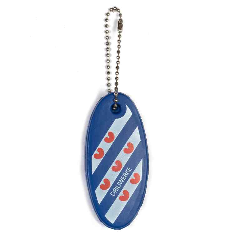 Dit “Driuwerke” is een zachte sleutelhanger met de opdruk van de Friese vlag met zijn herkenbare rode pompeblêden.