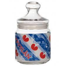 Een glazen snoeppot van Fryslân met de Friese vlag. makkelijk te sluiten door het mooi uitlopende deksel.