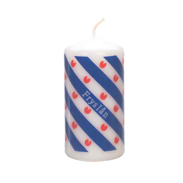 Deze witte stompkaars heeft de opdruk van de Friese vlag en in witte letters de tekst “Fryslân’.