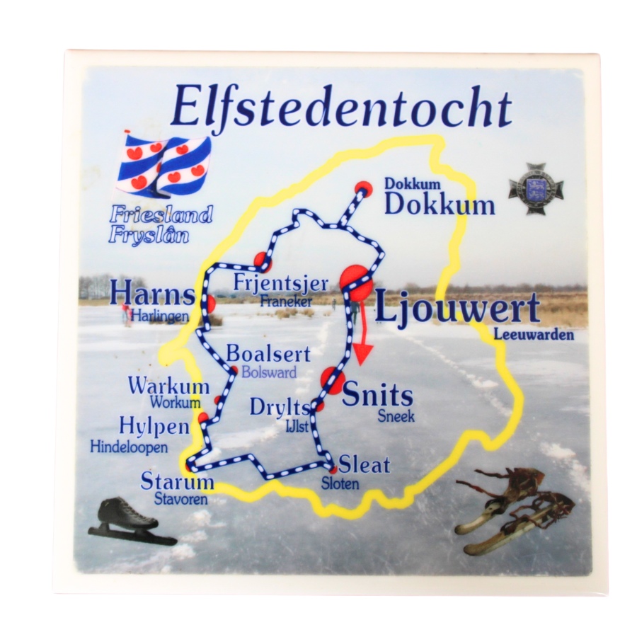 Op deze wandtegel Elfstedentocht vind je de iconische Elfstedenroute, voorzien van de Nederlandse en Friese benamingen.