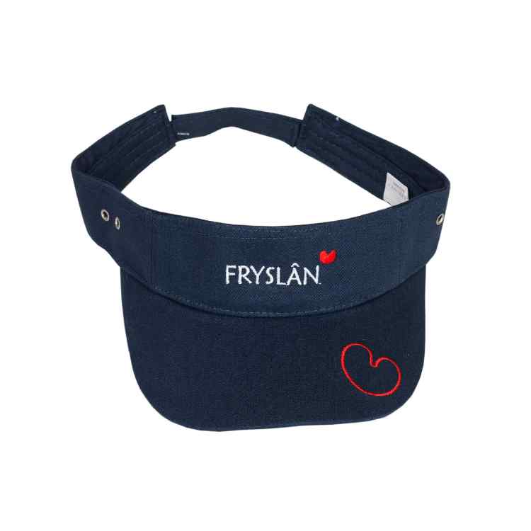 De blauwe zonneklep heeft in witte letters de tekst “Fryslân” op de voorkant met rode pompeblêden. Je vindt alle kleuren van de Friese vlag terug in deze klep.